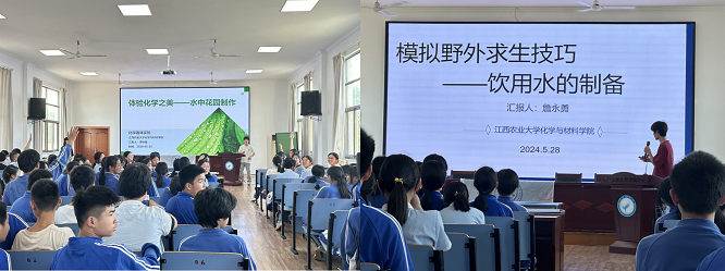科普团队结合九年级学生的化学基础知识,制作了“体验化学之美水中花园制作野外求生技能饮用水的制备变废为宝净水剂制备VR视频自来水的前世今生、骨痛之谜镉米形成机理”等5个主题视频和动画,走进农大附中九年级的延时课堂进行科普宣讲,课堂上设计了有奖问答、VR视频演示、沉浸式实验等系列活动,学生热情高涨,课堂气氛活跃,师生互动良好。