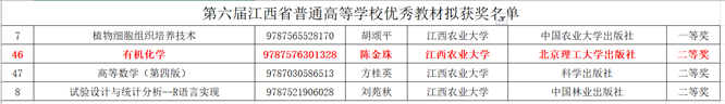 教材是体现教学内容和教学方法的知识载体,是进行教学的基本工具。其质量的优劣直接影响到教学质量的高低,进而影响学生综合素质的培养。化材院历来高度重视教材建设工作,不断完善教材体系,为教育事业的发展提供有力保障。今年会官网教师陈金珠主编的《有机化学》教材荣获第六届江西省普通高等学校优秀教材二等奖(农大仅三项)。