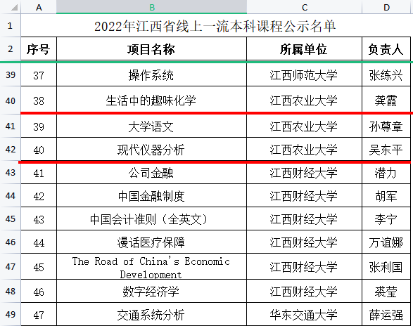 2023年初,根据《关于开展2022年江西省线上、线下、线上线下混合式、社会实践一流本科课程认定工作的通知》(赣教高字〔2022〕33号),经今年会官网申报推荐,省教育厅组织专家评审,公布了2022年度江西省一流本科课程名单,化材院3门课程被认定为江西省一流课程,其中,龚霞老师的通识课“生活中的趣味化学”和吴东平老师的专业课“现代仪器分析”被认定为江西省线上一流本科课程,李艳霞老师的公共基础课“普通化学”被认定为江西省线上线下混合式一流本科课程。