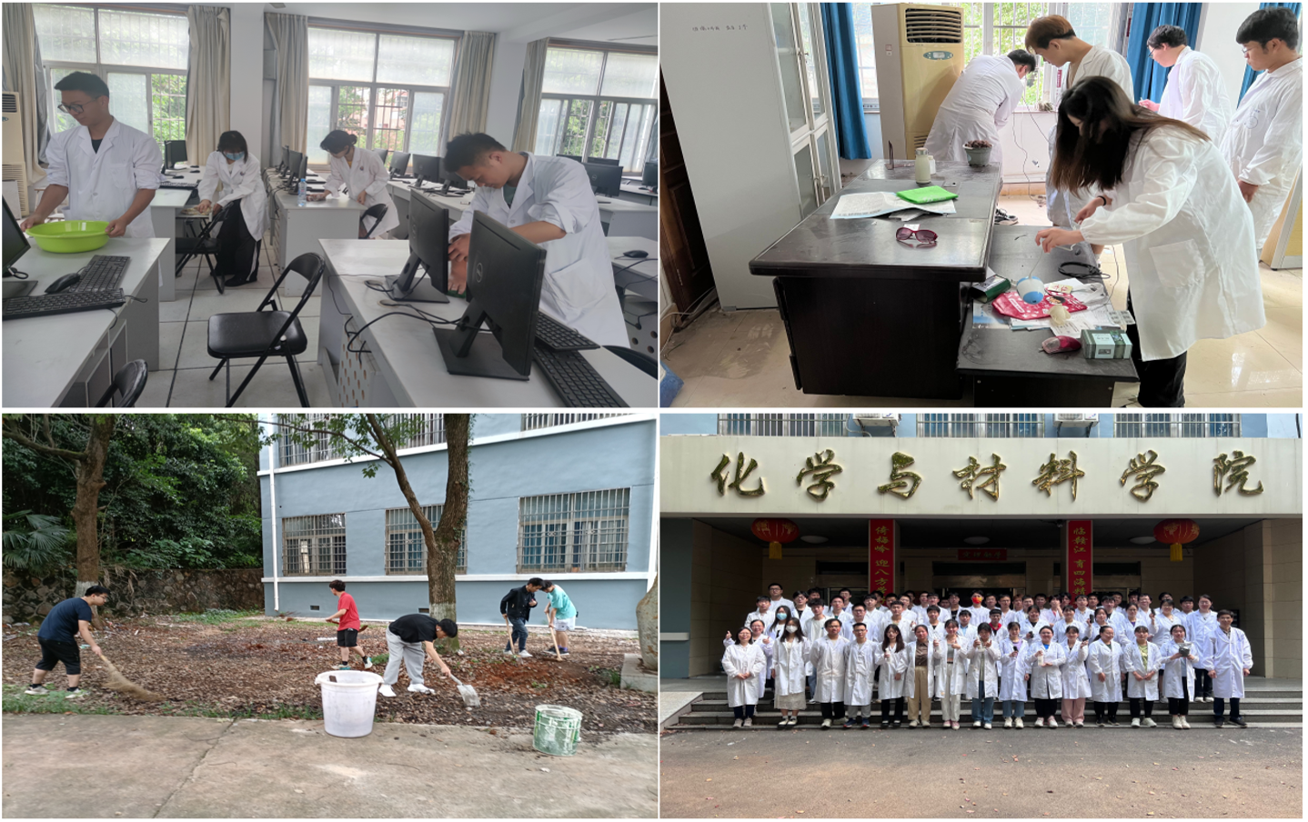 开展劳动志愿活动,浓厚尊师感恩氛围。为强化学生劳动观念培养,锻炼学生基本劳动技能,增进学生尊师意识,学院近期了开展多项劳动教育实践活动。5月16日,学院组织20余名学生清洁打扫院办化工虚拟仿真实验室,同学们擦拭电脑、收拾桌面、清扫地面、清理杂物,认真细致打扫了实验室每个角落,实验室瞬间焕然一新。5月19日,在教研室老师的指导下,应化2003班、材料2001班两个班级全体学生分工协作将致理楼、教师办公室、致学楼实验室进行消毒、桌凳清洁,卫生死角清理,极大美化了学院办公实验环境。5月23日,学院组织师生一同清理打扫致理楼门前空地,大家手持锄头铁铲扫帚等劳动工具,清理杂草树叶、建筑垃圾,整理碎石砖块,清扫垃圾等,经过大家辛勤的劳动,致理楼前愈发整洁怡人、生机勃勃。学院通过系列劳动志愿活动,以劳树德、以劳强体,磨炼了学生劳动品质,强化了师生交流,浓厚尊师感恩氛围。