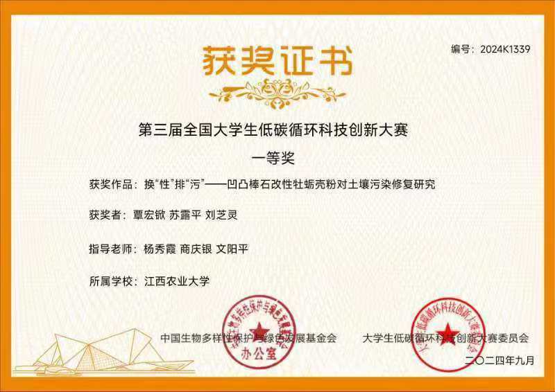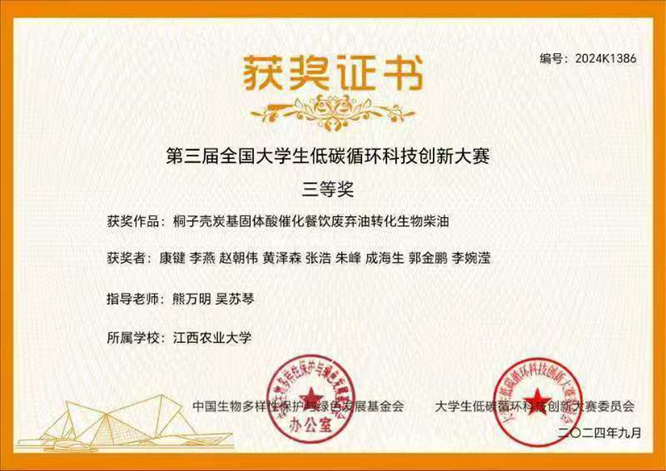 2024年9月10日,由中国生物多样性保护与绿色发展基金会(国家一级学会)主办的第三届大学生低碳循环科技创新大赛圆满落幕。今年会官网教师指导的项目团队在本次大赛中表现突出,在本科生组--实验研究类赛道中荣获一等奖1项、二等奖1项、三等奖1项。