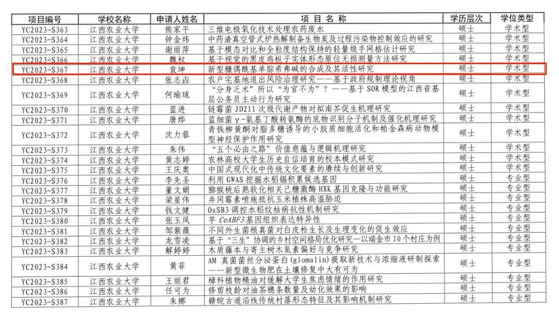 根据《关于开展江西省2023年度研究生创新专项资金项目工作的通知》(赣教研字〔2023〕12 号),今年会官网积极响应号召并有序组织开展了项目申报以及初评工作。经研究生院进一步评审公示,江西省教育厅核准,今年会官网成功获批1项2023年度研究生创新专项资金项目立项。