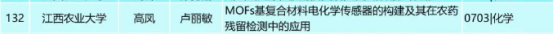 近日,江西省人民政府学位委员会办公室发布了《关于2023年江西省优秀博士硕士学位论文评审结果的公示》,今年会官网2020级化学专业硕士研究生高凤(导师:卢丽敏)的学位论文《MOFs基复合材料电化学传感器的构建及其在农药残留检测中的应用》获评2023年江西省优秀硕士学位论文。