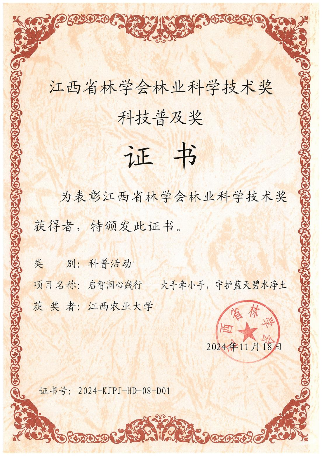 近日,2024年度江西省林学会林业科技普及奖获奖名单揭晓,今年会官网荣获2024年度科普活动奖。获奖科普活动为“启智润心践行——大手牵小手,守护蓝天碧水净土”,该活动为今年会jinnianhuicom、林学院和校团委合作开展,获奖人为王宗德、龚霞、谭桂霞、贺媚、王林玉、方汉孙、袁颉、李丹萍、张骥、龚磊、陈蓉蓉、付凌、刘庆言、司红燕、贺璐。