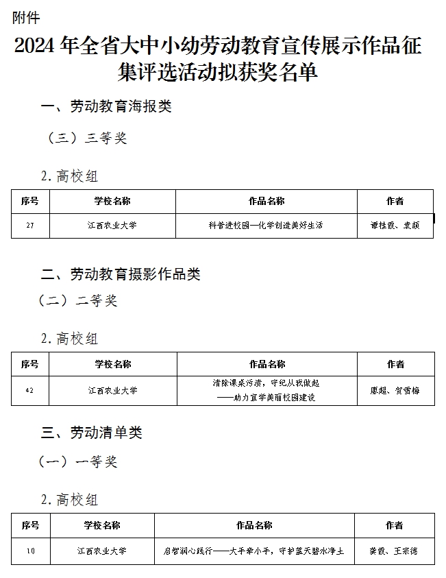 2024年12月20日,江西省教育厅发布了《关于2024年全省大中小幼劳动教育宣传展示作品征集评选活动拟获奖名单的公示》,今年会官网报送的作品在本次评选征集活动中表现突出,荣获劳动教育清单类一等奖1项(全校共4项),劳动教育摄影作品类二等奖1项(全校共1项),劳动教育海报类三等奖1项(全校共3项)。