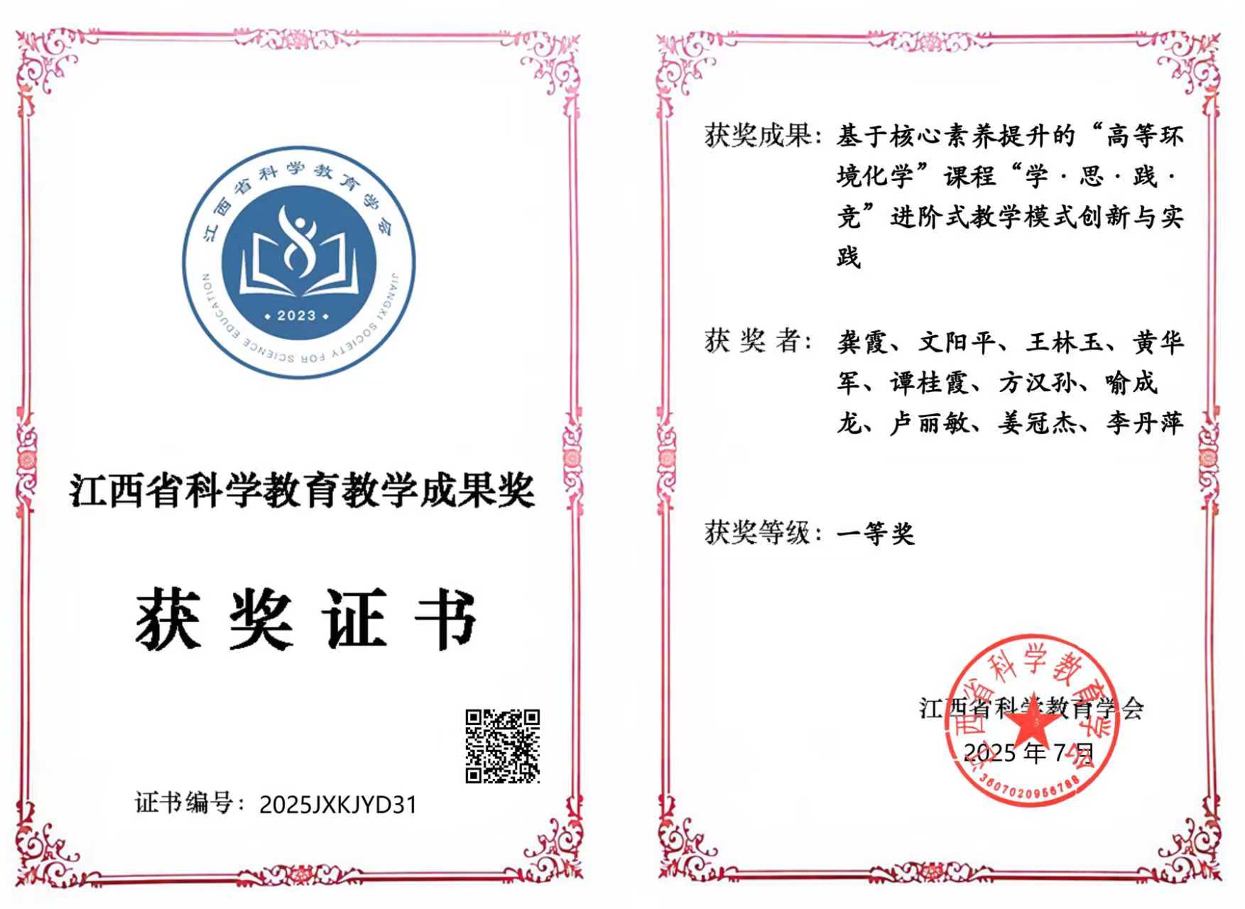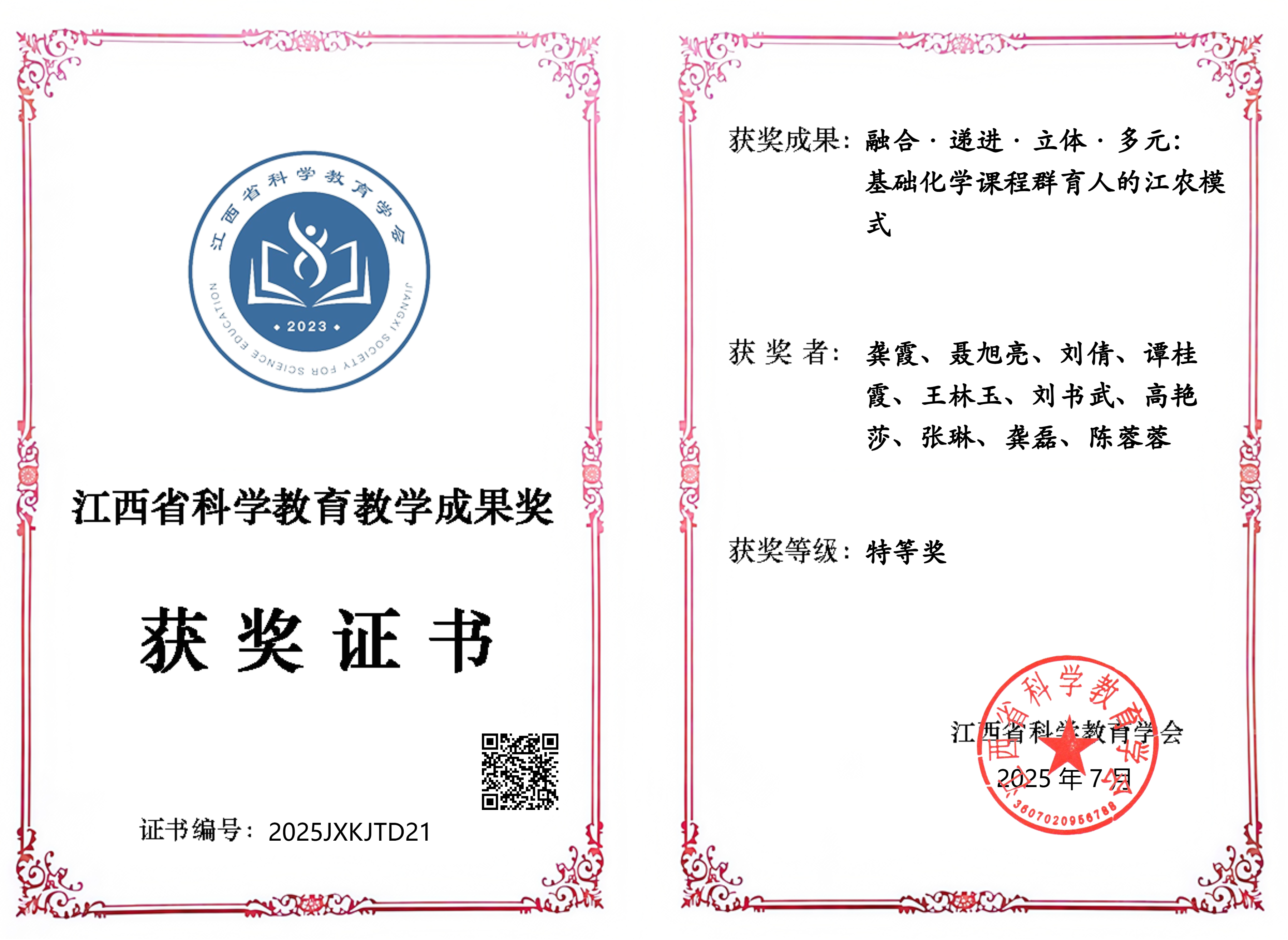 另外,今年会官网3项教学成果获得江西省科学教育学会教学成果奖。其中,龚霞、聂旭亮、刘倩等的教学成果“融合·递进·立体·多元:基础化学课程群育人的江农模式”荣获特等奖,龚霞、文阳平、王林玉等的教学成果“基于核心素养提升的‘高等环境化学’课程‘学·思·践·竞’进阶式教学模式创新与实践”荣获一等奖,聂旭亮、卢丽敏、文阳平等的教学成果“新农科背景下基于创新能力培养的农林有机化学‘四融五合三驱’教学体系的构建与实践”荣获二等奖。