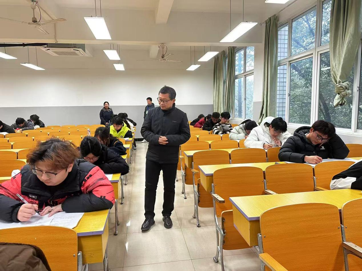 为严肃考风考纪,2026年1月5日,期末考试首日,学院党委书记刘庆言、副院长龚霞深入教学楼考场,开展巡查工作。
