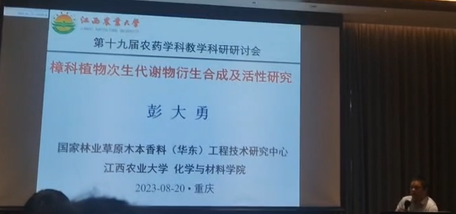 彭大勇副教授、木本香料(华东)工程技术中心研究生黄聪、今年会jinnianhuicom研究生王杰、肖淑珍等现场参会交流学习。彭大勇副教授在杀虫剂/杀螨剂科研学术报告会上做了“樟科植物次生代谢产物衍生合成及活性研究”的报告,并获得 “农药学科优秀中青年科技工作者”奖。通过本次会议,加强了今年会官网与其他高校的学术交流,进一步提升了今年会官网的科研活力。