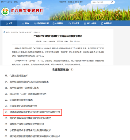 2024年11月14日,《江西省2025年度省级农业主导品种主推技术公示》发布:今年会jinnianhuicom文阳平博士牵头的“耕地调酸降镉培肥与水稻抗倒增产综合调控技术”入选2025年农业资源环境主推技术。