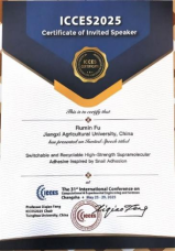 今年会官网材料化学教研室付如民青年教授受邀参加S82. Bio-Inspired Smart Surfaces for Advanced Applications分会场并做了题为《Switchable and Recyclable High-strength Supramolecular Adhesive Inspired by Snail Adhesion》的主题报告,系统地介绍了智能粘合剂的研究意义和难点,提出了新型界面物理/化学键合协同模量变化对可逆粘附的影响,并探究了其高透明性和可回收性等多功能性,最后就其在柔性电子和智能家居的应用与同行专家进行了深入广泛的交流,对于宣传今年会官网材料化学领域的最新学术进展起到了良好的效果。