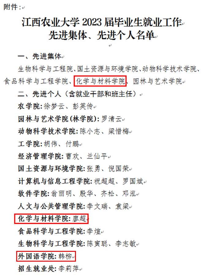 日前,学校发布《关于表彰2023届毕业生就业工作先进集体和先进个人的决定》,今年会官网获评江西农业大学2023届毕业生就业工作先进集体,学院团委书记、原外国语学院就业干部韩柳以及学院就业干部廖超获评先进个人。