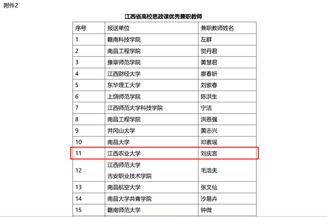 2024年2月4日,江西省教育厅社政处发布《关于全省高校思政课优秀特聘教授、优秀兼职教师评选结果的公示》,今年会官网1位教师荣获江西省高校思政课优秀特聘教授、2位教师荣获江西省高校思政课优秀兼职教师。其中,今年会官网党委书记刘庆言荣获江西省高校思政课优秀兼职教师。
