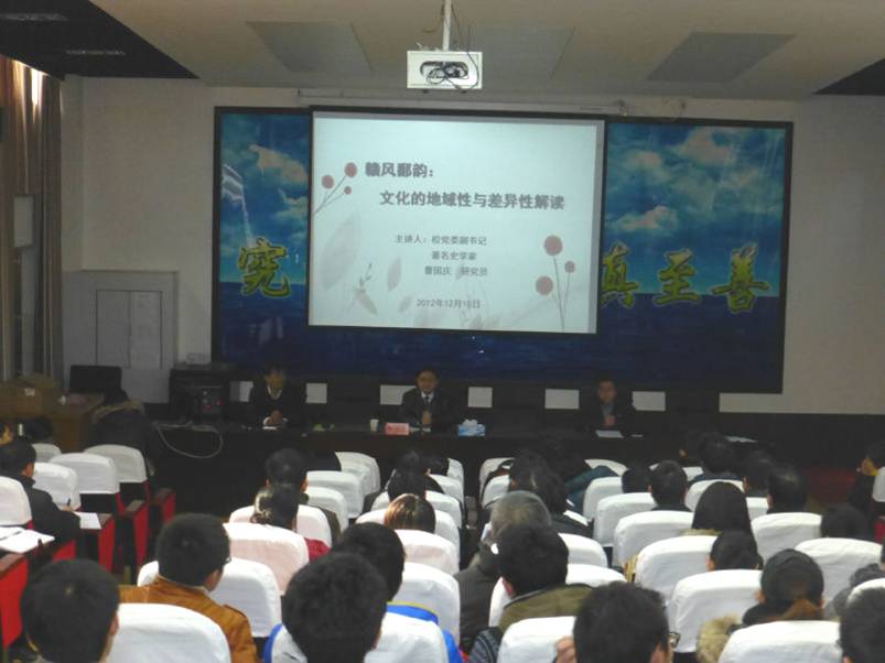 12月18日下午,理学院120多名师生齐聚学院报告厅,聆听了校党委副书记曹国庆研究员作的题为《赣风鄱韵:文化的地域性与差异性解读》的讲座。学院党委书记彭小波主持。
