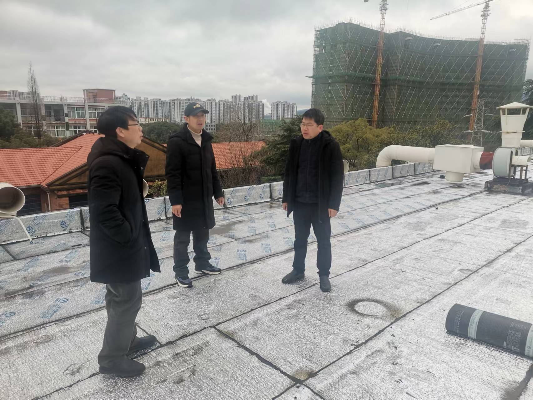 学期伊始,为了进一步加强实验室安全管理,确保公共有机化学实验室的安全,2023年2月间,王宗德院长和卢丽敏副院长趁着雨歇几度上到致学楼楼顶,全面排查实验室漏水情况,并与基建处项目负责人现场办公,对漏水改造项目提出了整改意见,积极推进实验室楼顶漏水改造项目的实施。项目施工时,院领导再度深入施工现场,指导工人施工,确保项目又快又好完成。