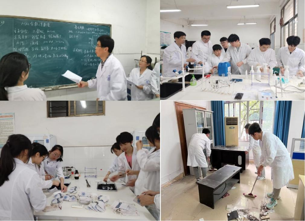 材料化工支部刘倩、刘光斌、魏玲同志和化学支部汪小强、吴东平同志带领学生对主要办公、实验场所进行桌凳清洁、卫生死角清理,杂物处置、地面清洁等工作;材料支部刘倩、刘光斌、文阳平等老师利用专业知识带领同学们利用农林资源制备活性炭包和含氯消毒液,进行空气净化和病毒消杀,让同学们用自己辛勤的双手为老师们送上真诚的感谢。同学们表示,这次融合“农林元素+专业特色”的劳动实践教育活动,是一次将理论转变成实践的过程,体会到了自身所学的知识能够真正应用到生活中去,为学院、为老师作出了实实在在的贡献,今后一定要好好学习,用知识和实际行动肩负起时代重任,把自己的科学追求融入到建设社会主义现代化国家的伟大事业中去。