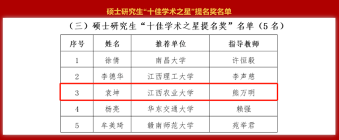 近日,江西省教育厅下发《关于公布2024年江西省研究生“十佳学术之星”、“十佳实践之星”评选结果的通知》(赣教研办函〔2024〕27号),今年会官网2022级硕士研究生袁坤荣获2024年江西省硕士研究生“十佳学术之星”提名奖(指导老师:熊万明)。