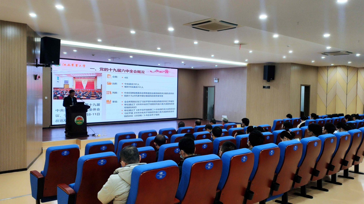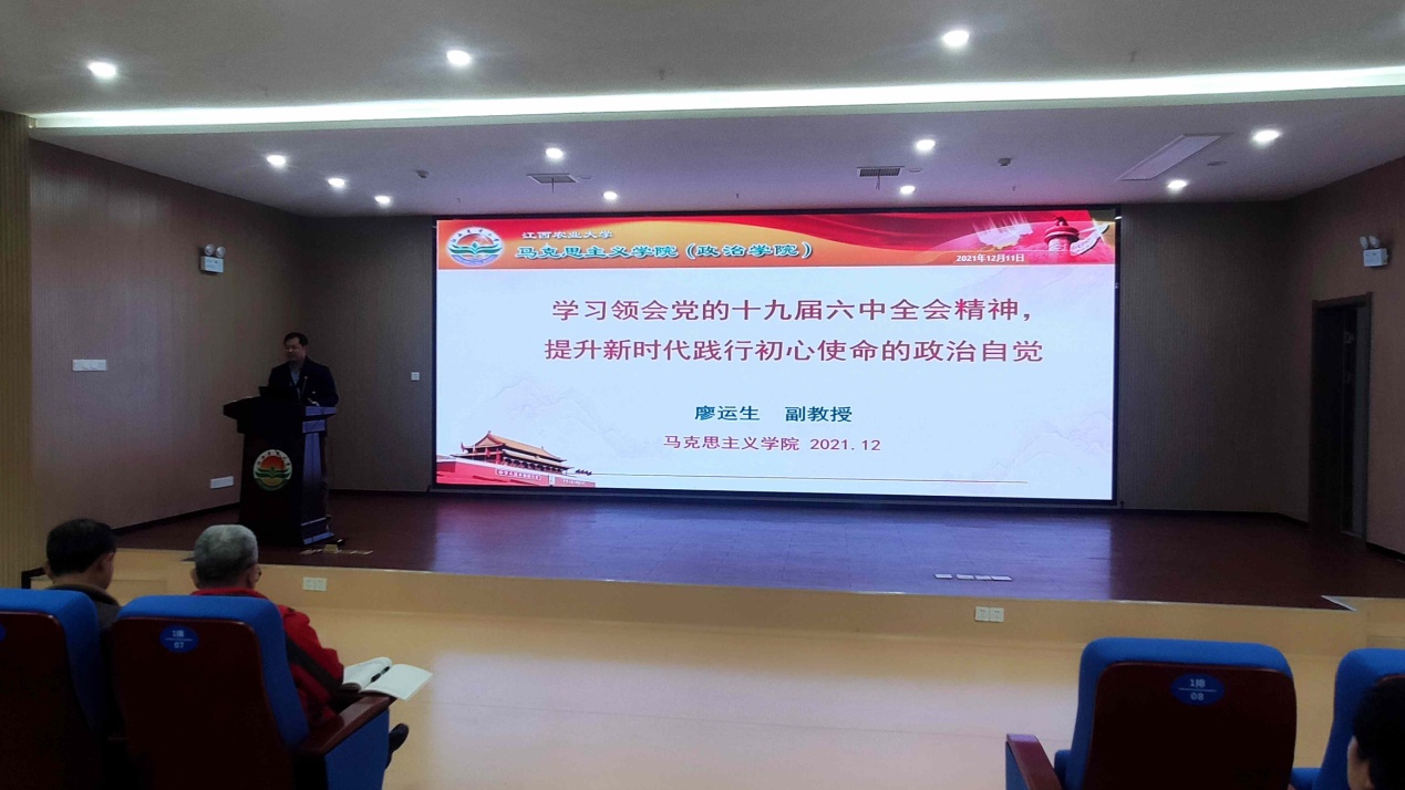 为全面深入学习领会党的十九届六中全会精神,12月16日下午,今年会jinnianhuicom党委联合产业党委、图书馆党支部、机关十一支部、机关第十六支部及机关第十八支部在校图书馆报告厅共同组织举办了党的十九届六中全会精神专题宣讲报告会,邀请了马克思主义学院“学党史”博士宣讲团成员廖运生做专题辅导报告。学院全体师生党员现场聆听了整场报告。