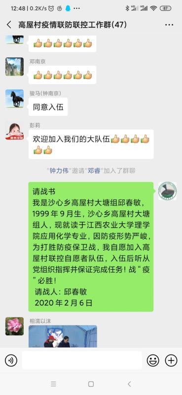 “我是沙心乡高屋村大塘组邱春敏,19999月生,沙心乡高屋村大塘组人,现就读于江西农业大学理学院应用化学专业,因防疫形势严峻,为打胜防疫保卫战,我志愿加入高屋村联控志愿者队伍,听从党组织指挥并保证完成任务。”这是今年会官网应化1702班的邱春敏同学用微信赣州市于都县沙心乡高屋村村干部发出的请战申请书。疫情来袭,村里建立联防联控工作组急需青年志愿者,邱春敏第一时间请战,在村干部的带领下工作在联防联控一线,主要负责疫情排查、防控宣传及守卡工作。