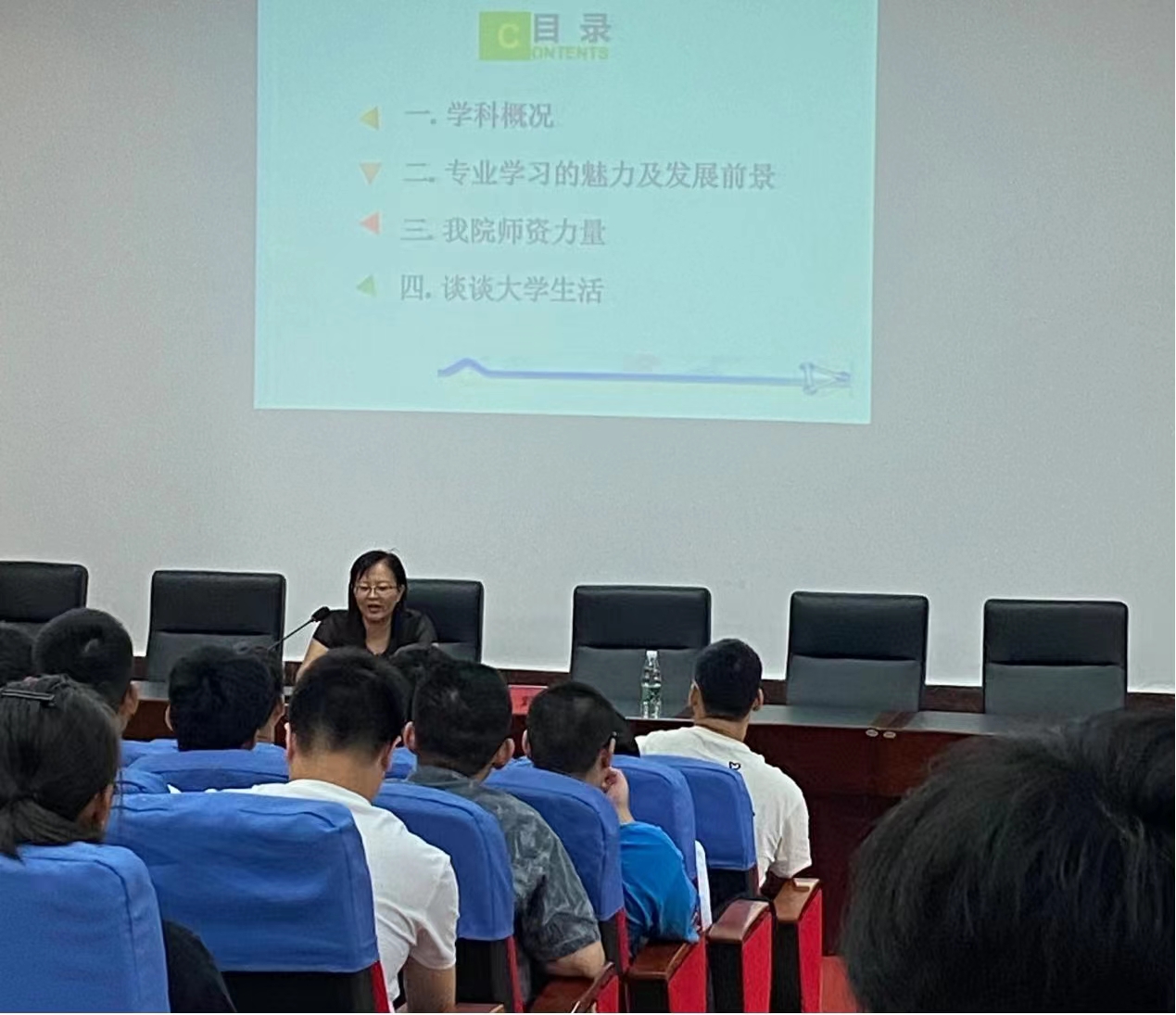 卢丽敏从漫话化学魔力、简述专业特色、浅谈大学能力培养三个方面展开介绍,用详实数据和典型事例论证了为什么要选择应用化学,展现了化学是一门具有实用性、创造性和科学性的学科,希望新生具备适应环境、自学、语言表达、独立自主、识人交友等能力。刘倩分别从学院概况、专业发展前沿、培养目标、专业发展前景、师资力量等方面介绍了材料化学专业,并对新生大学生活提出了三点建议,一是学习上要拼搏奋进,不负芳华;二是交友上要心胸开阔,开放包容;三是生活上要学会运动,培养爱好。