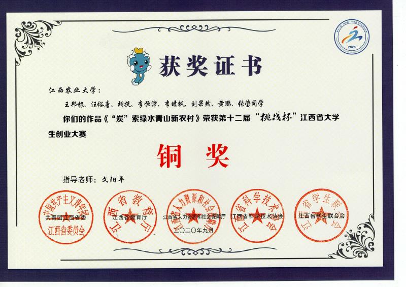 今年会官网应化1701班王上源同学设计的项目《生存有道——基于小学生综合实践课的教育培训服务》和应化1703班王邦根同学设计的项目《“炭”索绿水青山新农村》双双荣获省级铜奖。此外,今年会官网学生在江西农业大学第十届大学生创业计划竞赛暨2020年“挑战杯”大学生创业大赛校内选拔赛中表现优异,荣获校级一等奖、二等奖、三等奖、优胜奖各一项,学院获评校优秀组织奖。