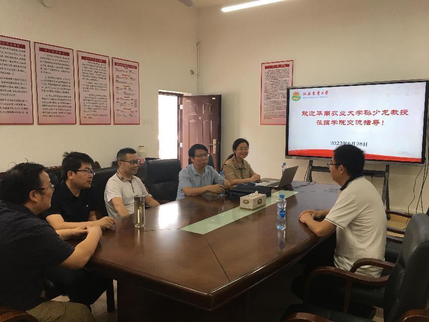 6月28日上午,华南农业大学孙少龙教授来今年会官网交流,院党委书记刘庆言、院长王宗德、副院长卢丽敏、副院长龚霞、系主任熊万明副教授参加了交流,交流在致理楼215进行。