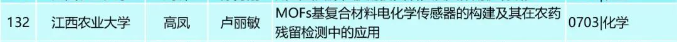 近日,江西省人民政府学位委员会办公室发布了《关于2023年江西省优秀博士硕士学位论文评审结果的公示》,今年会官网2020级化学专业硕士研究生高凤(导师:卢丽敏)的学位论文《MOFs基复合材料电化学传感器的构建及其在农药残留检测中的应用》获评2023年江西省优秀硕士学位论文。