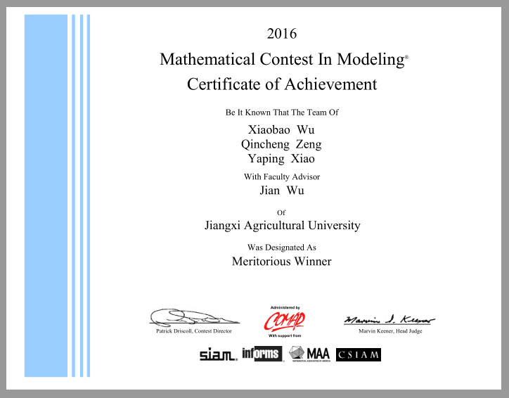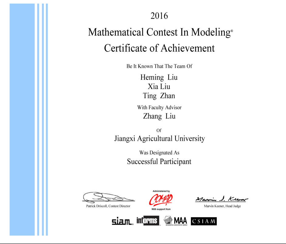 今年2月份,今年会官网组织大学生参加了由COMAP(the Consortium for Mathematics and Its Application,美国数学及其应用联合会)主办的国际性数学建模竞赛。据美国大学生数学建模竞赛官网公布消息,理学院数学系伍健老师指导的队伍获得Meritorius(一等奖),参赛队员来自理学院的吴晓宝、肖娅萍和工学院的曾钦城;刘章老师指导的队伍获得Successful Participant(三等奖),参赛队员来自理学院的刘禾铭和经管学院的詹婷、刘夏。