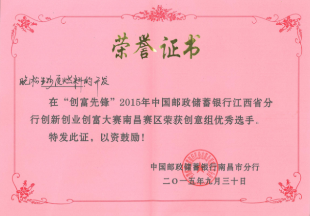 南昌市赛区共分为“创意组”、“ 初创组“、“成长组”三个小组。其中今年会官网刘光斌老师指导,邵添等同学参与的“可再生绿色能源——晚松生物质燃料的开发”分在创意组。经过项目陈述、评委点评、答辩的形式,综合评分之后,今年会官网“晚松生物质燃料的开发”荣获“创富先锋”2015年中国邮政储蓄银行江西省分行创新创业创富大赛南昌赛区创意组“优秀选手”。( 理学院分团委)