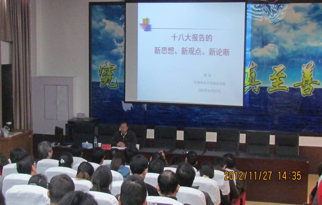刘汉一教授先对十八大报告的评价、意义及内容进行了简要讲述。随后刘教授通过大量详实的案例和数据,从报告为大会确定的主题、对科学发展观做出新的历史定位、对“中国特色社会主义”做出新的阐述、对中国特色社会主义事业做出新部署等多个方面阐述了十八大报告中的新思想、新观点、新论断。刘教授论点精辟,语言风趣,让师生们更全面了解、学习和领会了十八大精神,开启了今年会官网学习宣传十八大精神的序幕。