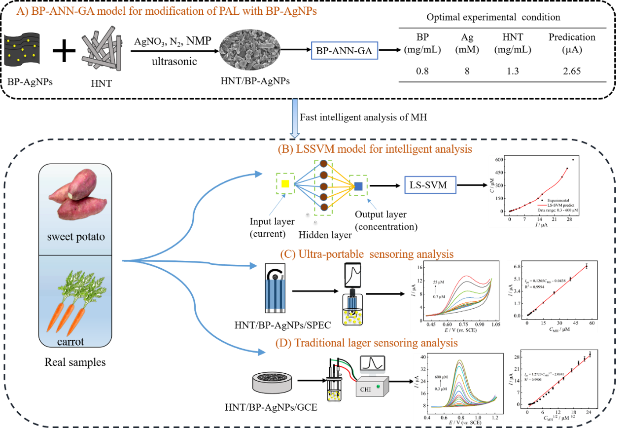 本论文提出了机器学习辅助黑磷(BP)改性埃洛石(HNT)构建电化学传感器,通过优化HNT, BP, AgNO3的浓度,进而提高传感器的灵敏度,在此基础上将机器学习和便携式传感器结合实现智能化便携式检测MH含量,并成功应用于红薯和胡萝卜中MH的含量检测,为未来人工智能在纳米材料制备和智能传感集成方面的发现奠定了基础。