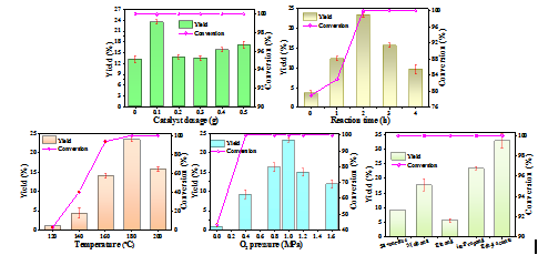 本论文基于钙钛矿氧化物具有高氧迁移率、高稳定性、低成本和优异的氧化还原性能等优点,构建了高效且可重复使用的稀土LaFeO3钙钛矿在无碱绿色条件下催化氧化木质素基香草醇以生产香草醛。通过对催化剂用量、反应时间、反应温度和O2压力进行优化及溶剂效应的考察,于最佳条件下可实现100%的香草醇转化率和33%的香草醛产率。在此基础上,对LaFeO3钙钛矿进行了循环使用测试并揭示了其在催化氧化香草醇过程中的活性位点和催化作用机理。总之,我们这项研究工作可为后续构建稀土LaFeO3基钙钛矿作为生物炼制木质素生产香草醛的高效和可重复使用的催化剂提供了一种可扩展、绿色和可持续的策略。