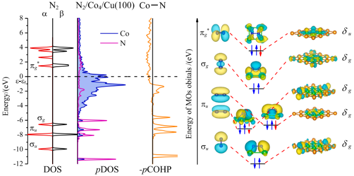 该论文探讨了表面组成对N2分子活化、还原机理的影响。其电子结构(态密度,晶体轨道重叠布居和分子轨道能级)的计算结果表明:N2分子的吸附结构对催化剂表面组成比较敏感,特别是在TM4/Cu(100)表面,N2在TM4/Cu(100)表面呈扁平状吸附,说明N2氢化还原更为可行;当Fe、Co和Ni原子掺杂到表层后,在一定程度上可以提高N2与TMn/Cu表面的结合能力,尤其是Co原子的引入可在最大程度上提高N2的吸附稳定性,因此可通过调节Co原子在Cu(100)表面的掺杂程度,有可能筛选出适合于N2的Cu基催化剂。